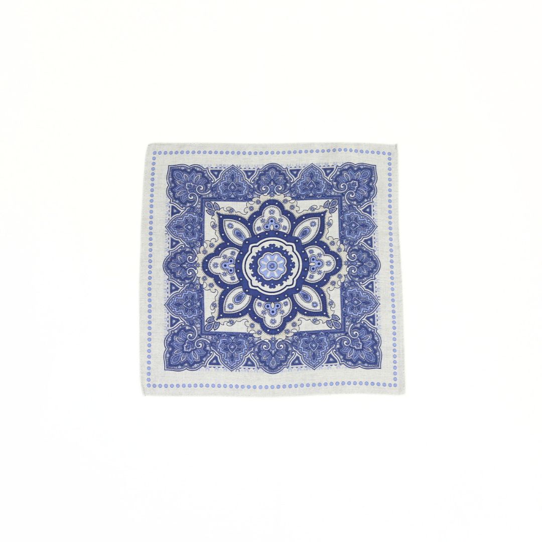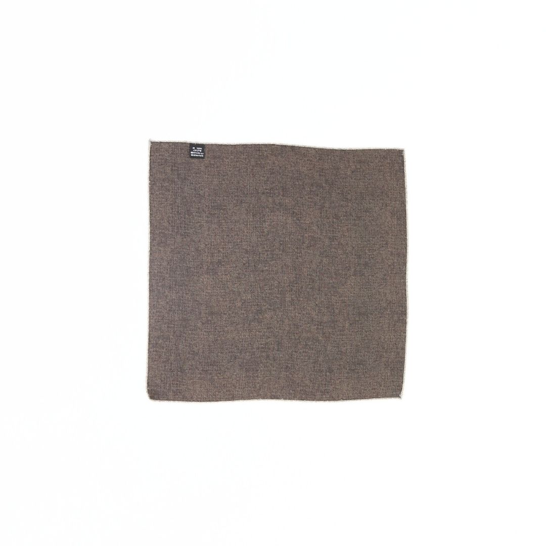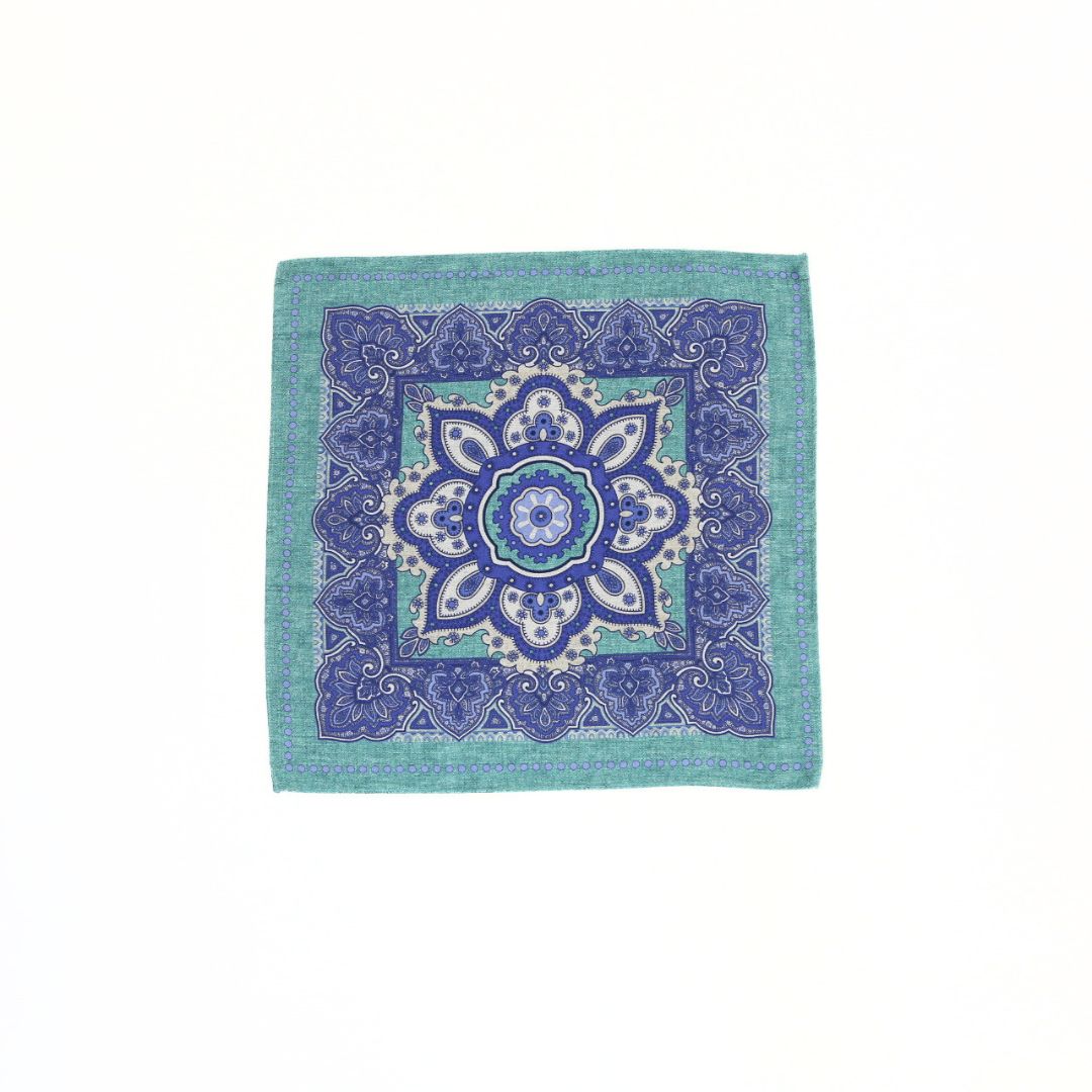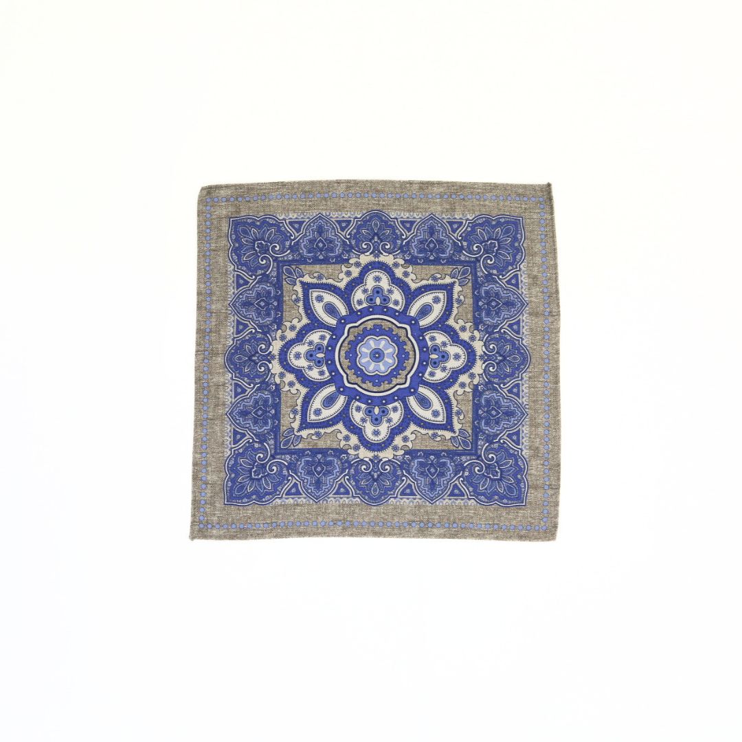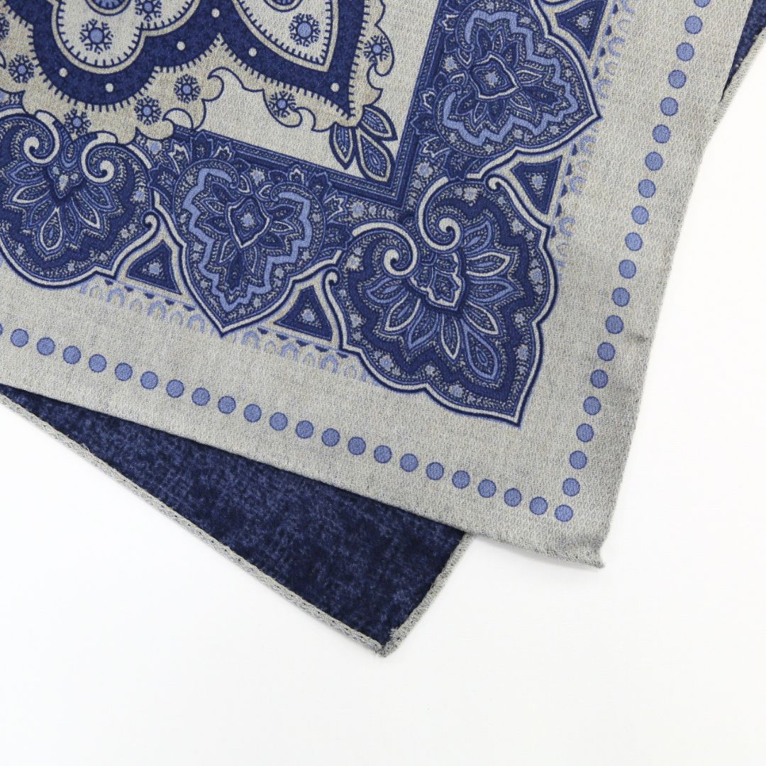 イタリア製のポケットチーフ。表面には存在感のあるクラシックなメダリオンを配し、裏面は表情のある無地のリバーシブル仕様。 ドレカジからフォーマルシーンまでそれぞれのスタイルに合わせて活躍する一枚。 ※サイズ 約31cm×約31cm
