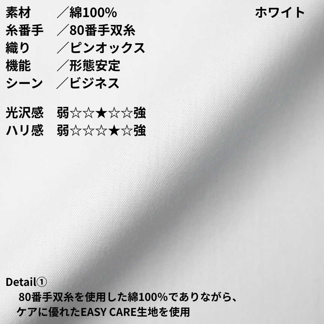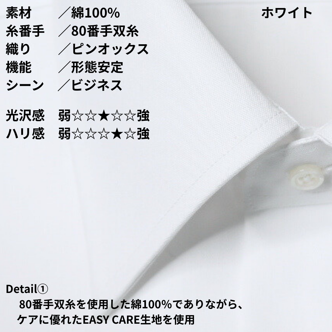 Detail① 80番手双糸を使用した綿100%でありながら、ケアに優れたEASY CARE生地を使用