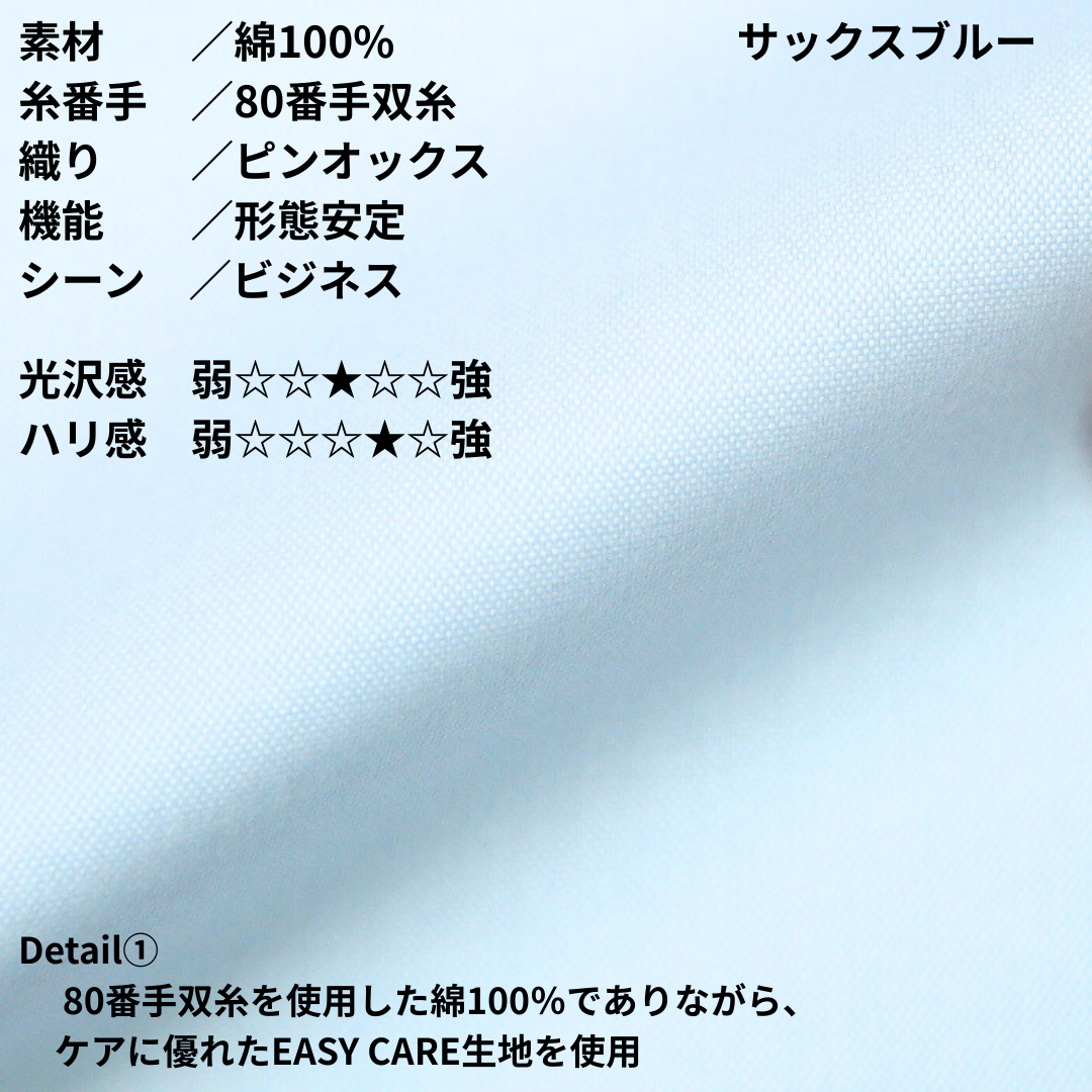 Detail① 80番手双糸を使用した綿100%でありながら、ケアに優れたEASY CARE生地を使用