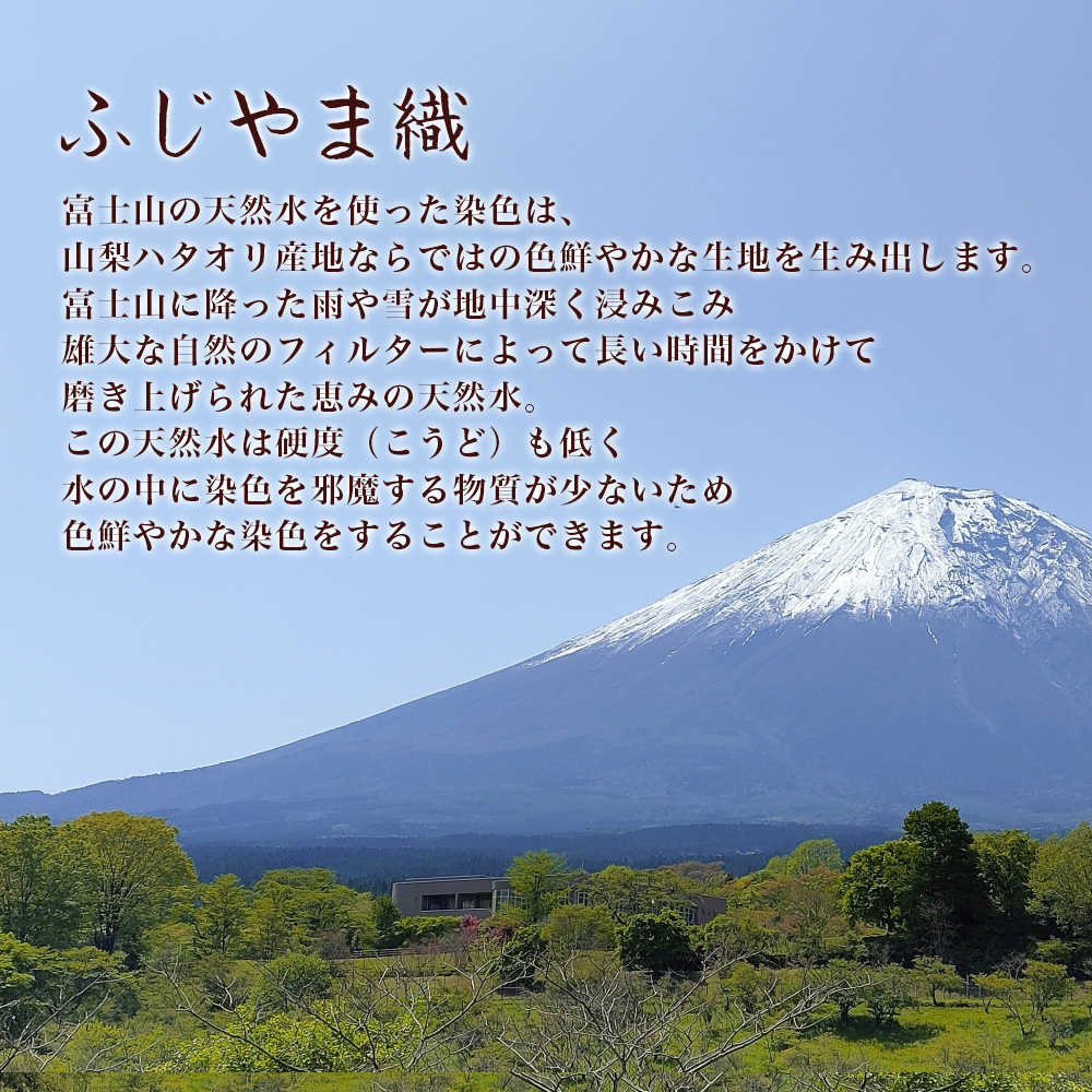 * ふじやま織とは、富士山に降った雨や雪が地中深く浸み込み、雄大な自然のフィルターによって長い時間をかけて磨き上げられた恵の天然水。硬度も低く染色を邪魔する物質が少ないため、色鮮やかな染色をすることができます。富士山の清らかな湧き水の恵み、富士山麓の豊かな自然の中で受け継がれてきた機織りの技、富士山が作った織物、それがふじやま織。