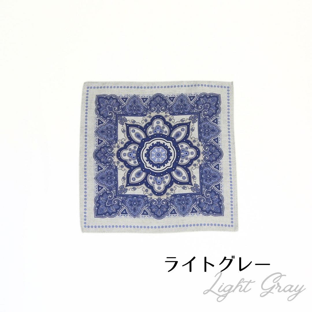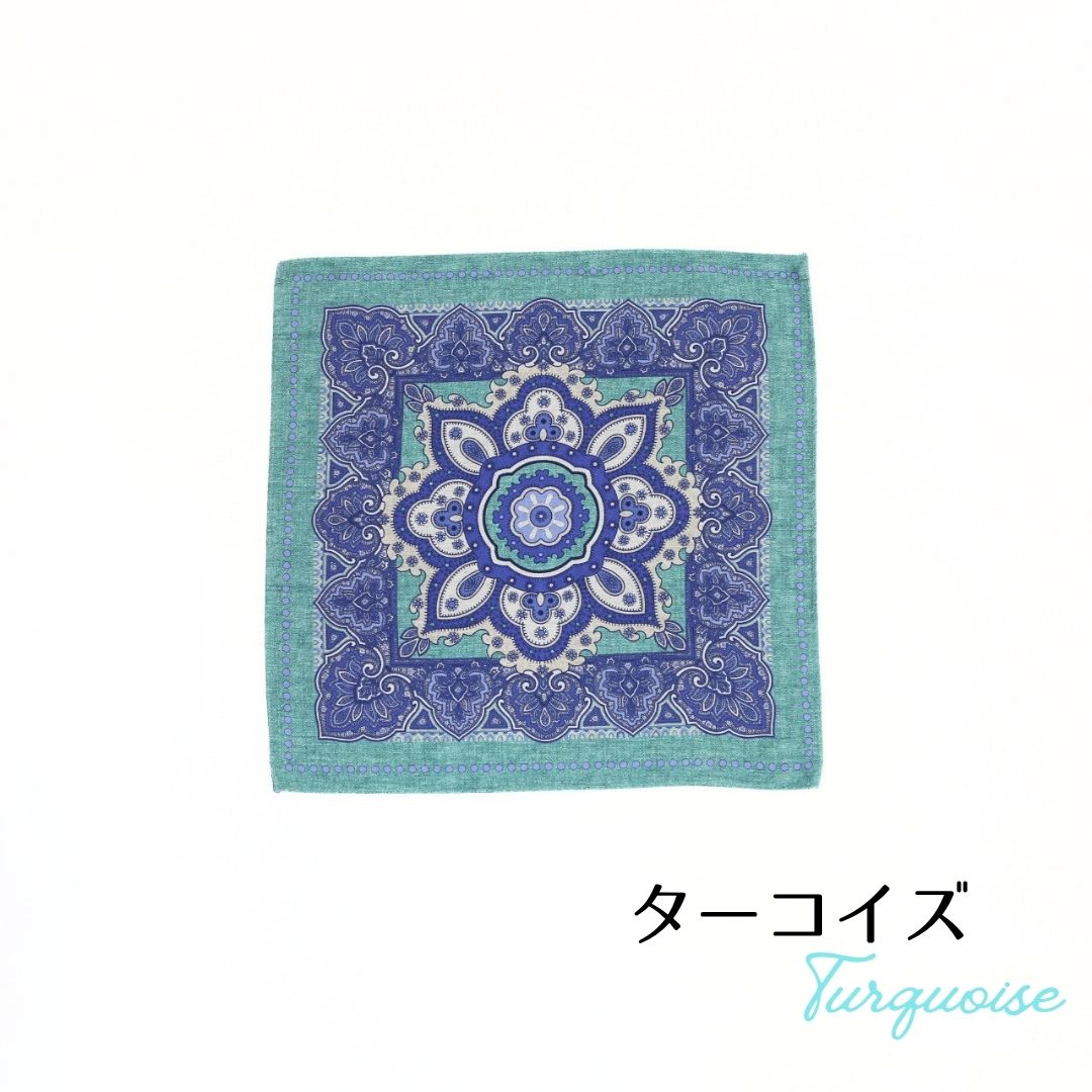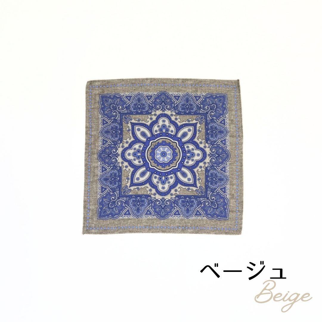 イタリア製のポケットチーフ。表面には存在感のあるクラシックなメダリオンを配し、裏面は表情のある無地のリバーシブル仕様。 ドレカジからフォーマルシーンまでそれぞれのスタイルに合わせて活躍する一枚。 ※サイズ 約31cm×約31cm