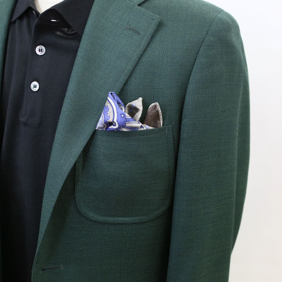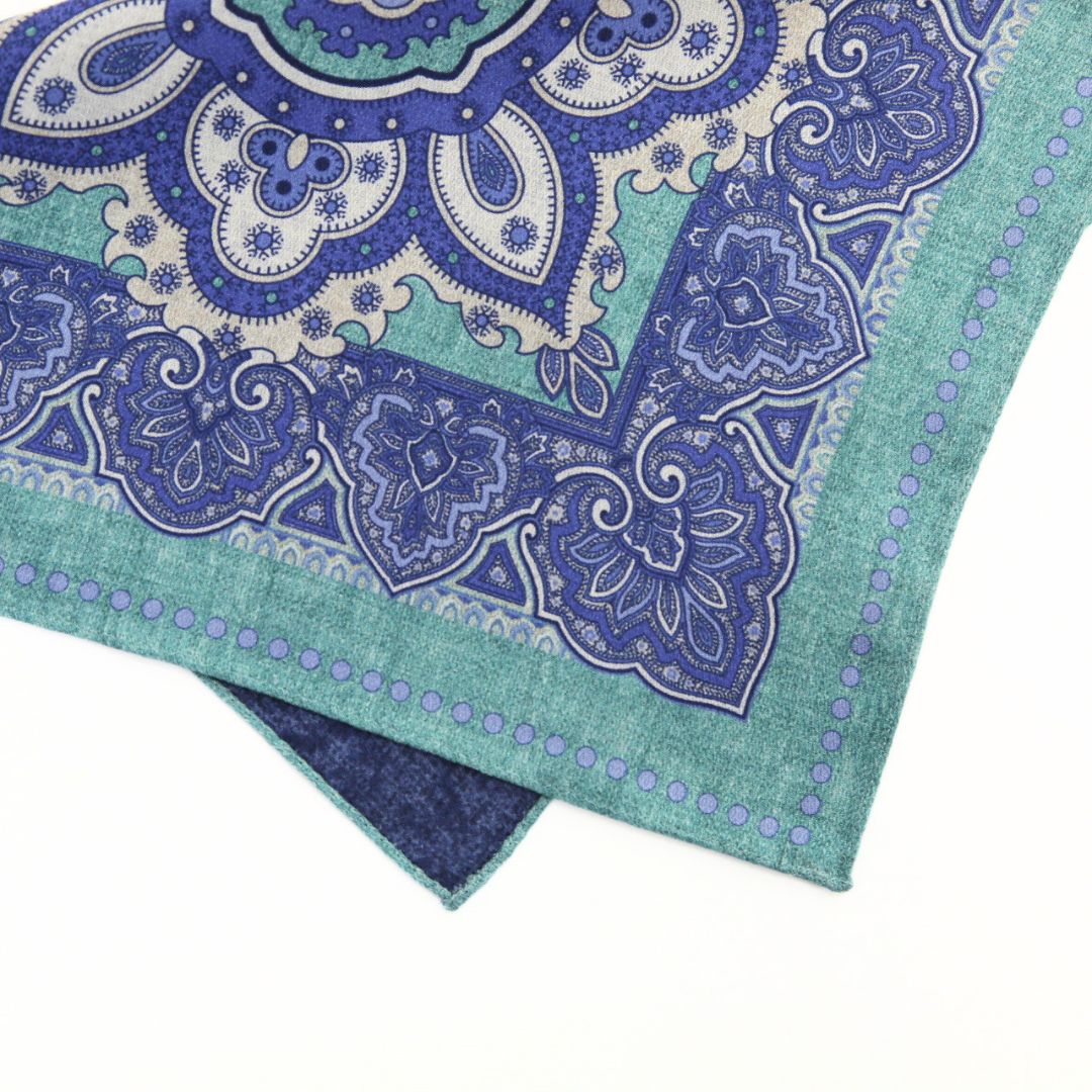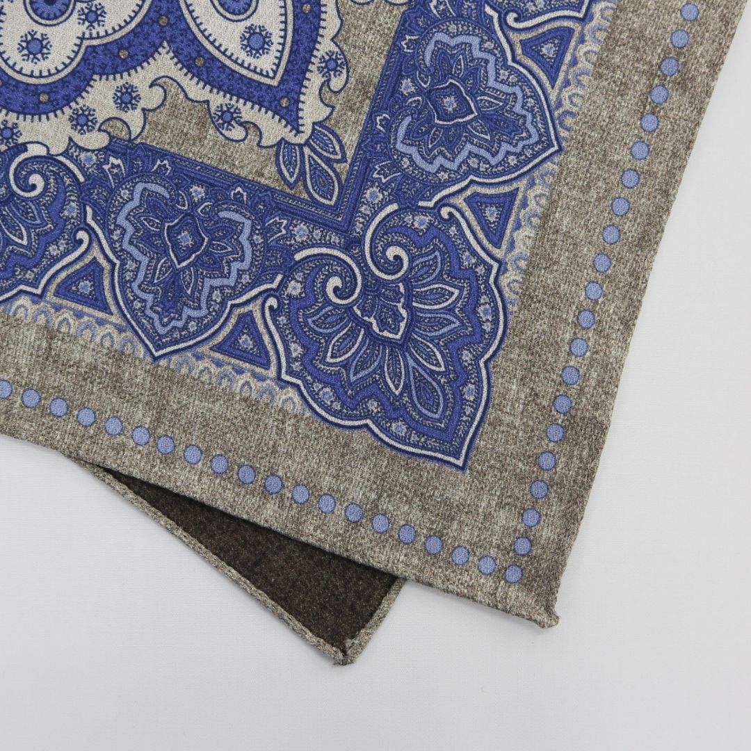 イタリア製のポケットチーフ。表面には存在感のあるクラシックなメダリオンを配し、裏面は表情のある無地のリバーシブル仕様。 ドレカジからフォーマルシーンまでそれぞれのスタイルに合わせて活躍する一枚。 ※サイズ 約31cm×約31cm