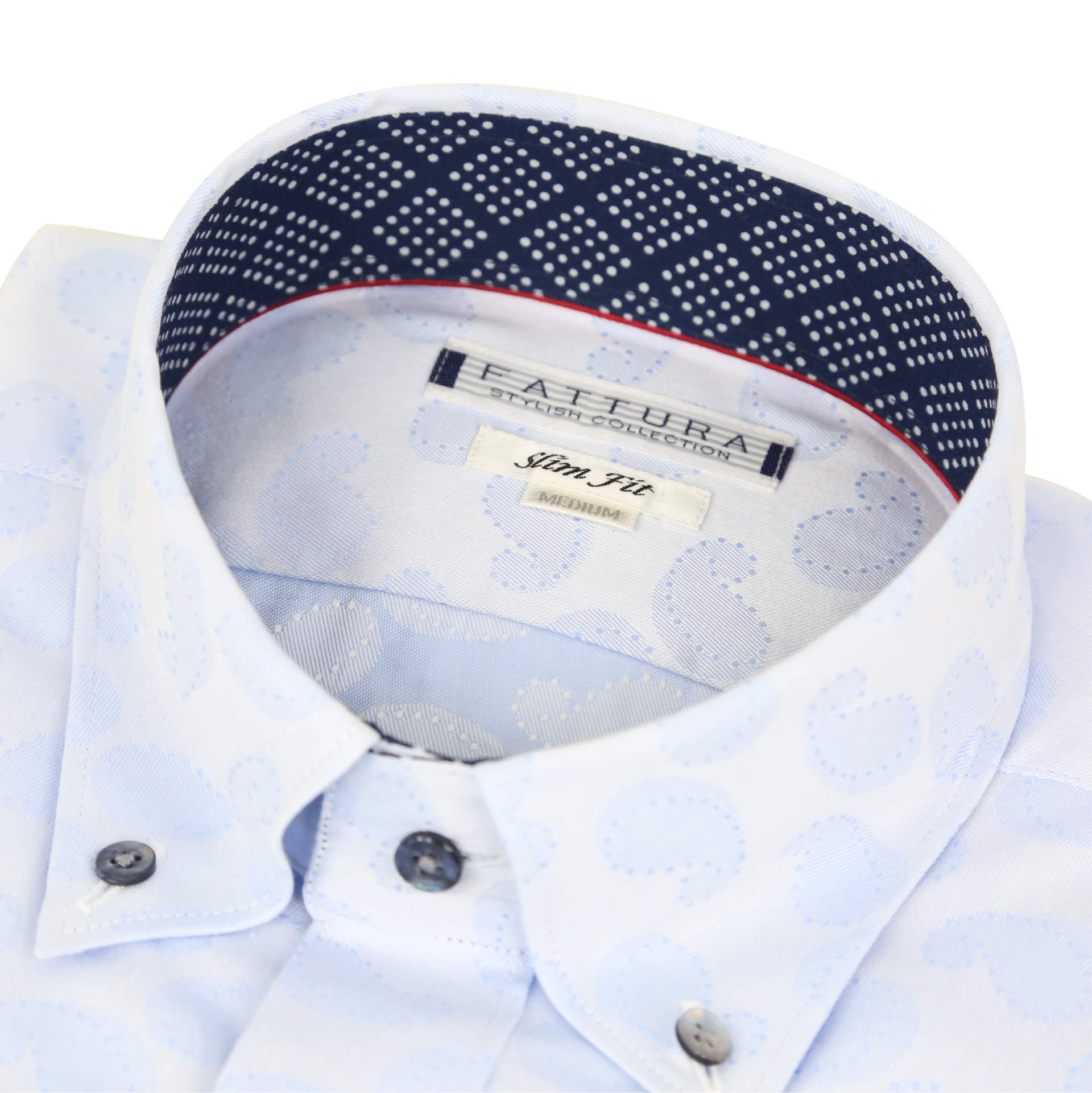 衿裏にパイピング、ラペルカフスを施したデザインシャツ。スリムフィットボディ。 【原産国】日本製 【サイズ】S・M・L 注意事項:モニターの発色具合によって色が異なって見える場合がございます。