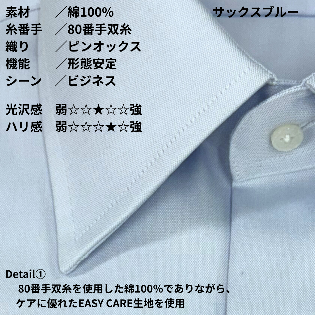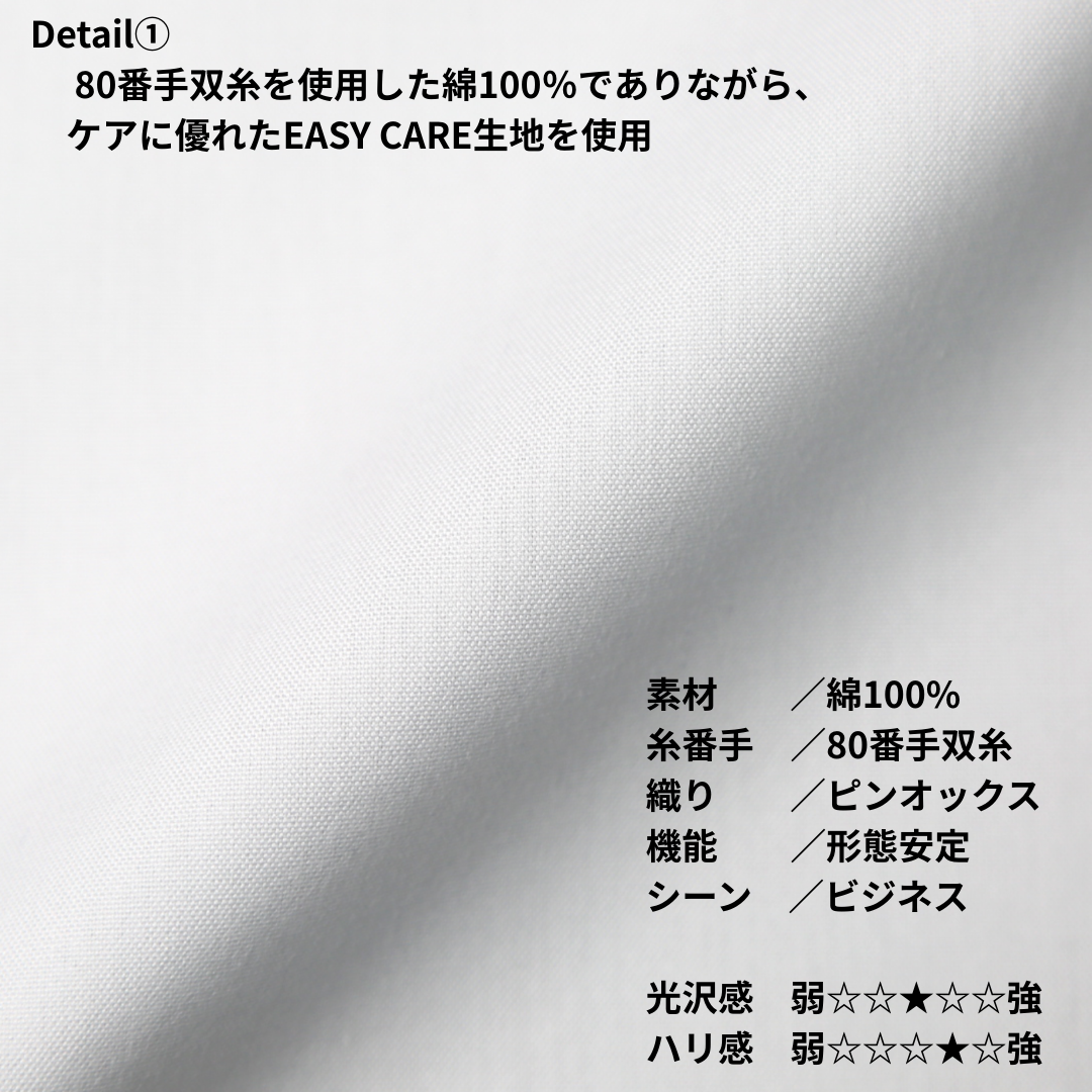 Detail① 80番手双糸を使用した綿100%でありながら、ケアに優れたEASY CARE生地を使用